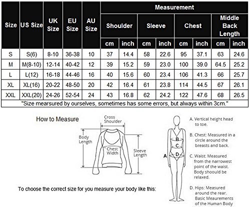 Size:XL(UK 20-22)-----Shoulder:44cm/17.2"--------Chest:119.2cm/46.5"-----Sleeve:63cm/24.6"-----Middle Back Length:72cm/28.1"