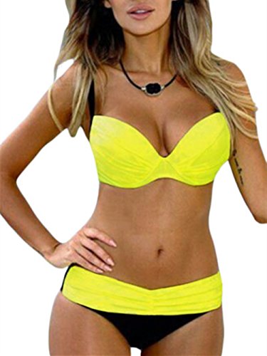 Love the sexy look of a classic bikini but want a little more coverage for your booty? The Padded Gather Push-up Bikini Set is the perfect solution. Contrast padded top and front waist of the bottom, shoulder straps and bottom back stay the same. The bralette top reveals your cleavage with its dramatic plunging halter neckline, steel wire and the padding is undetectable. Clasp back ensure a perfect fit to flatter your figure.