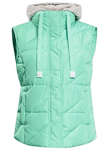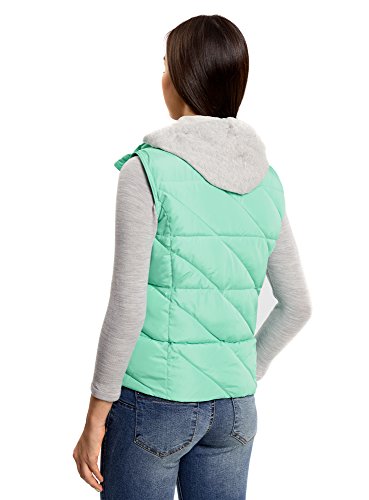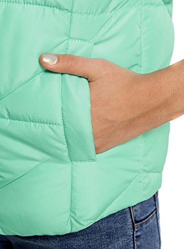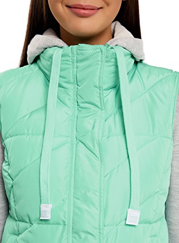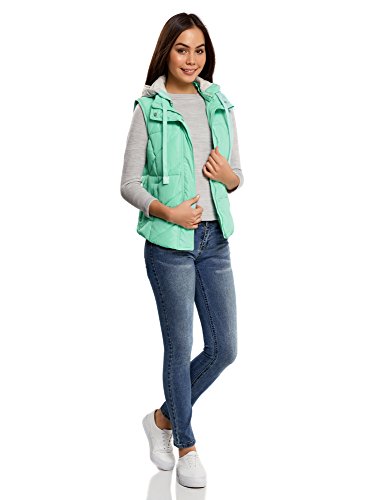 Warm quilted vest with jersey hood and hidden front closure. Princess seams in the front provide slim, figure-hugging fit, and have openings for two vertical welt pockets. The high stand collar reliably protects your neck from cold air. To keep your head warm, the vest is equipped with a cotton jersey hood with an insulated layer of lining. The size of the hood's opening can be adjusted by a drawstring. The vest is particularly comfortable in cold weather and does not restrict movements. The warm and comfortable sporty hooded vest is perfect for outdoor activities, relaxing in the countryside, or a morning run. It is a great match for active pants or any jersey trousers. The quilted vest is also ideal for casual teenage outfits. It will look wonderful with jeans, leggings or skirts of absolutely any length or style. Choose warm sporty footwear like soft boots with molded soles, lace-up shoes, or tall riding boots. Add knit mittens or fluffy headphones and you will look irresistible.