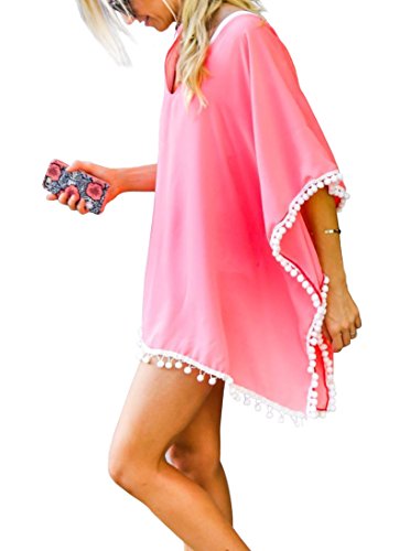 the stylish swimsuit beach cover up is made of light and breathable chiffon. It keeps you coolfortable in hot weather. The semi sheer and v neck constructions with cute pom pom trim all around each edge make the coverup very sexy and chic. Wide sleeves would protect the tops of your shoulders from sunburn. It is perfect on a tanning salon, pool, beach and many occasions.